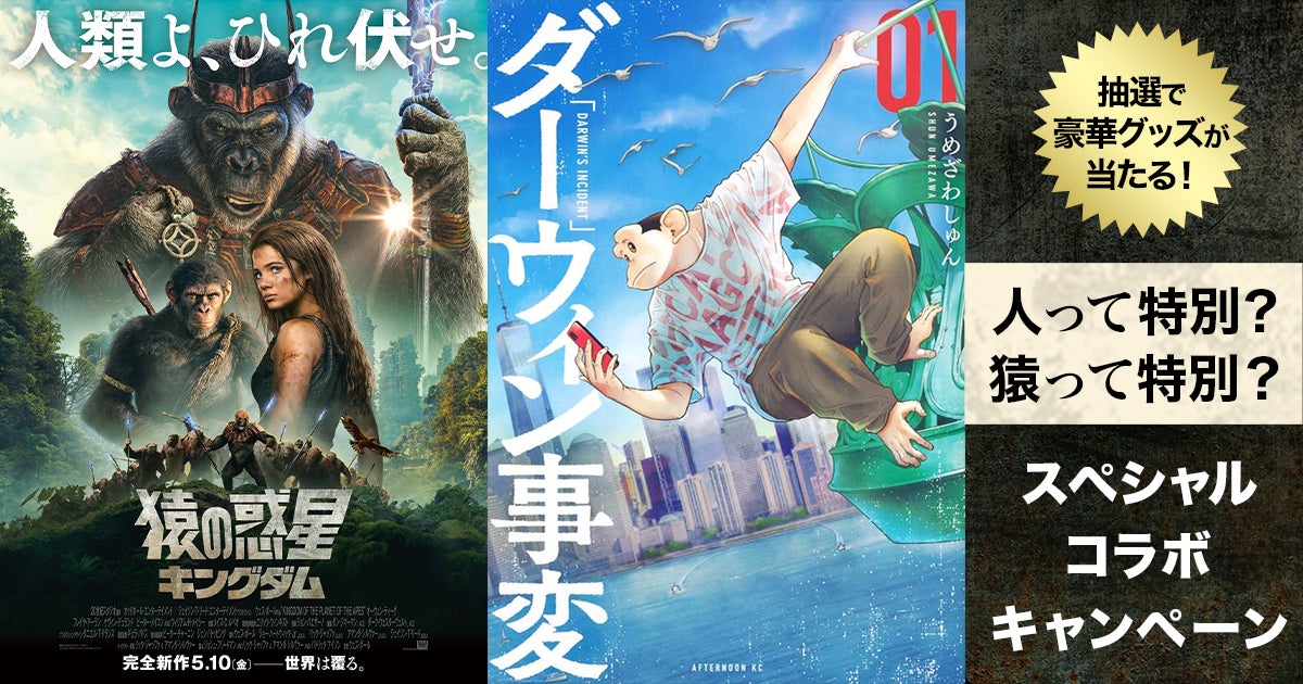 2024年5月10日に公開される映画『猿の惑星/キングダム』と、5月22日に発売予定のマンガ『ダーウィン事変』がコラボ企画を始動!抽選で豪華グッズが当たるキャンペーンが開催中です。