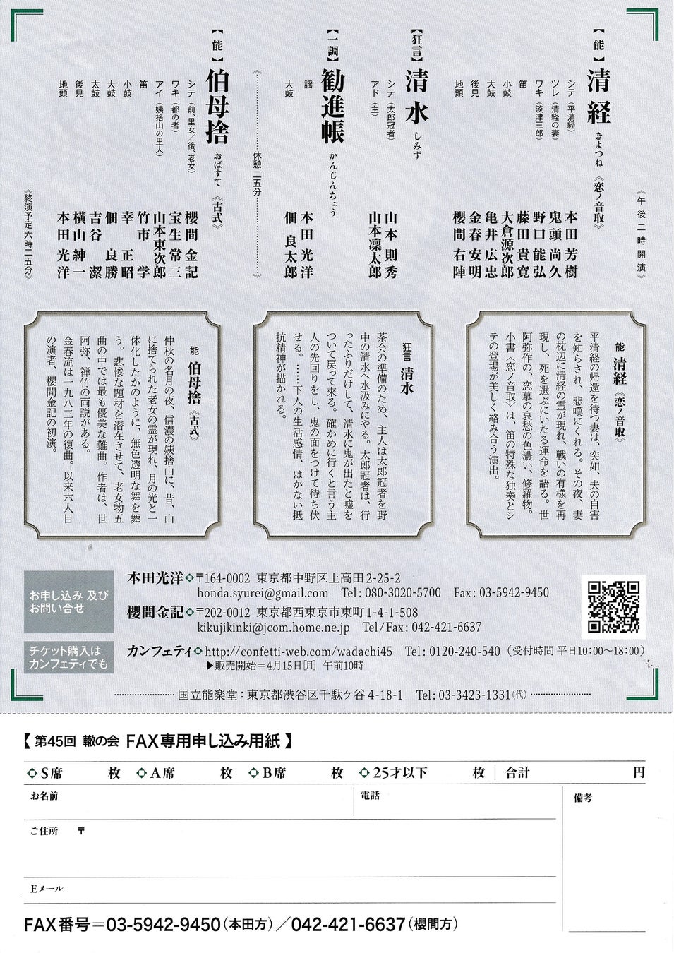 本田光洋と櫻間金記が45年の友情と競い合う「轍の会」では、若手から長老までが出演し、伯母捨や清経恋ノ音取などが演じられます。