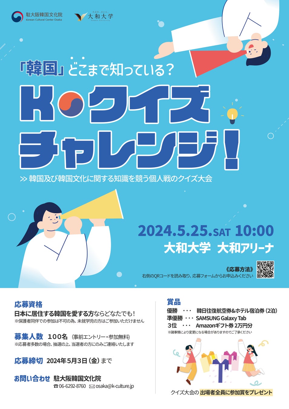 大和大学との共催イベント、「韓国、どこまで知っている?K-クイズチャレンジ!」が5月25日(土)に大和大学 大和アリーナで開催されます。