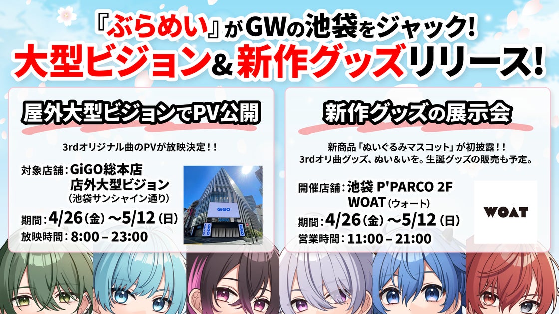 「ぶらめい」の3rdオリジナル曲のPVが、GiGO総本店の店外大型ビジョンで期間限定放映されます。