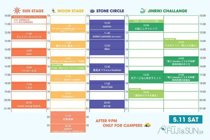 静岡県富士市で開催されるキャンプフェス「NEC presents FUJI & SUN’24」のタイムテーブルが発表されました。