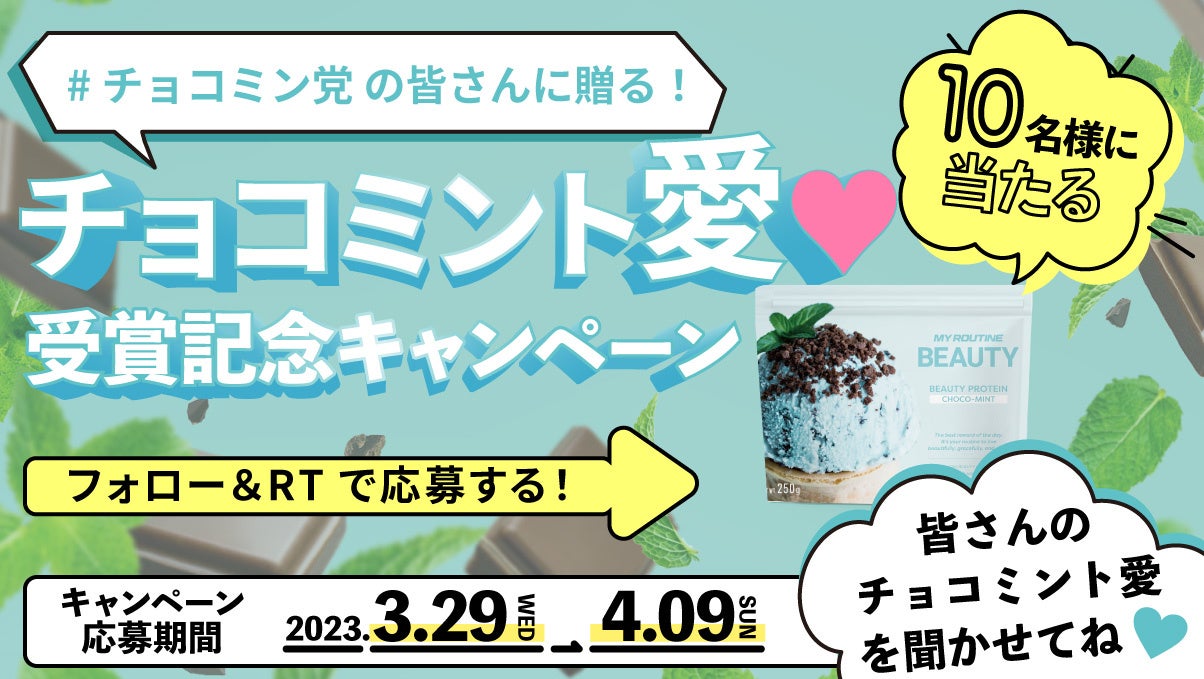 - SNSでチョコミント愛ピソードを募集し、抽選で各10名に「マイルーティーン BEAUTY チョコミント風味プロテイン」をプレゼント。トリプルプロテイン配合で置換えダイエットにもおすすめ。