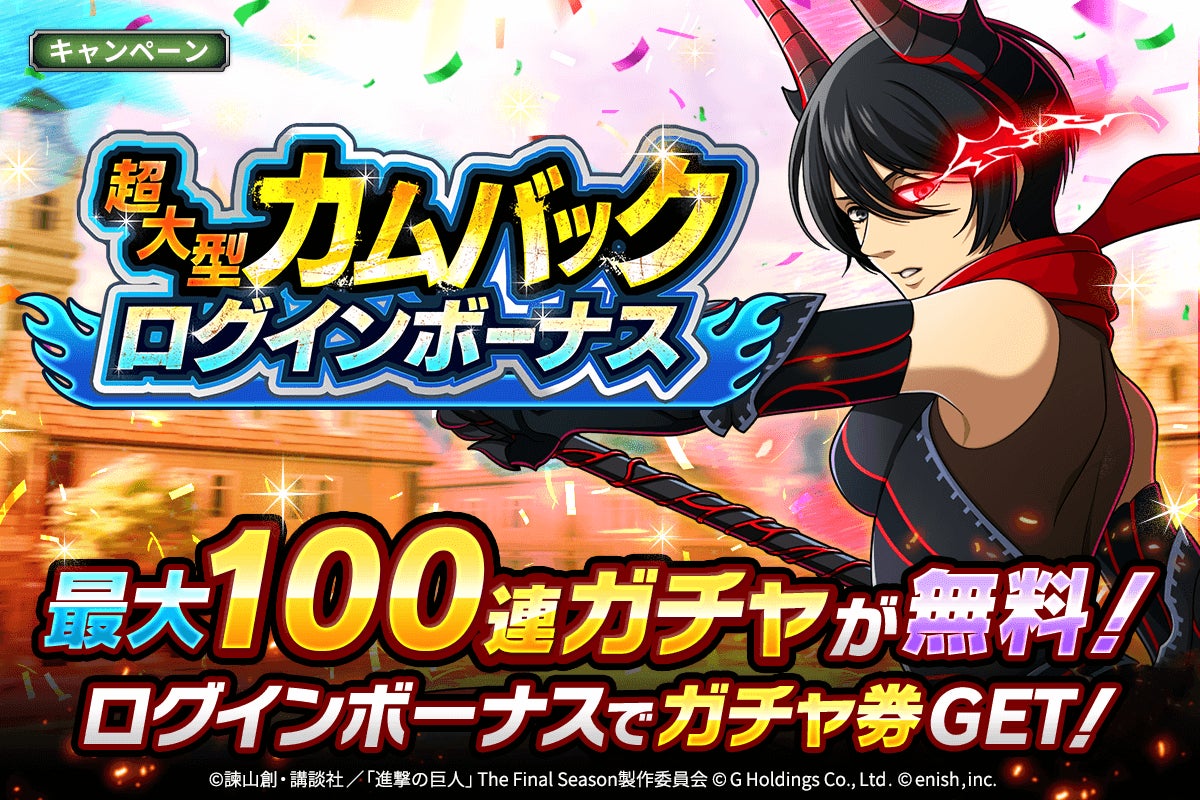 特典として、最大100連無料の「超大型カムバックガチャ」やログインボーナスが用意されています。
