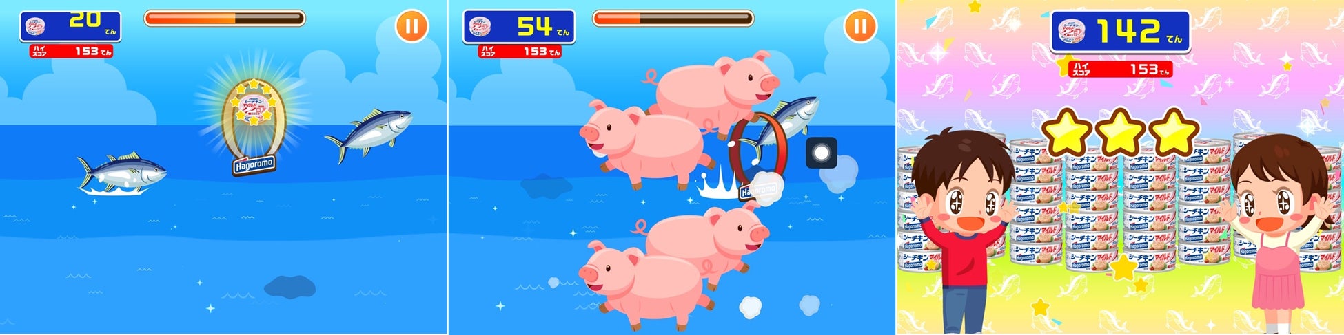 ゲームサービスでは、シーチキン製造工程を学ぶ「シーチキンをつくろう!」や魚をリングに潜らせる「はごろもマジックリング!」が楽しめます。