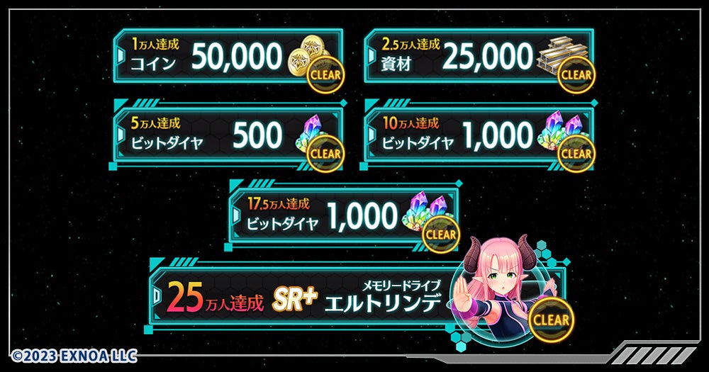 10日間ログインすることで合計3,000個の「ビットダイヤ(無償)」(ガチャ10回分)や「SR以上確定ガチャのピース」500個、「SSR確定ガチャのピース」100個などをプレゼントいたします。