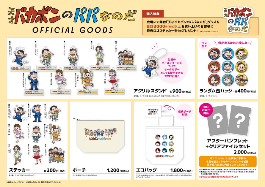 - アクリルスタンド、ランダム缶バッジ、ステッカー、ポーチ、エコバッグ
