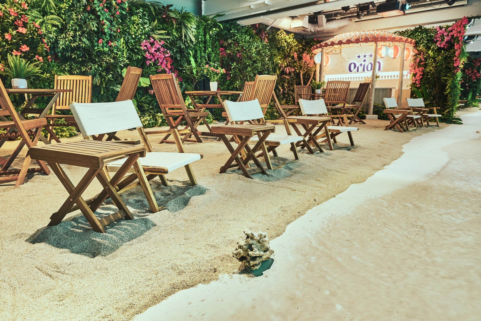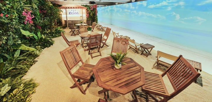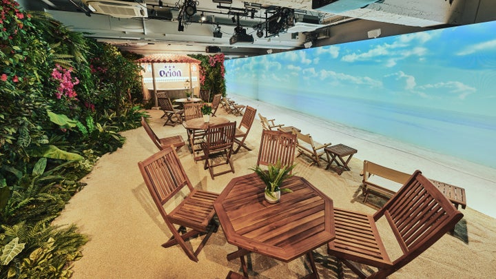 バー内は与那覇前浜ビーチを再現し、プロジェクションマッピングや白砂、植物などでリアルな空間を演出します。