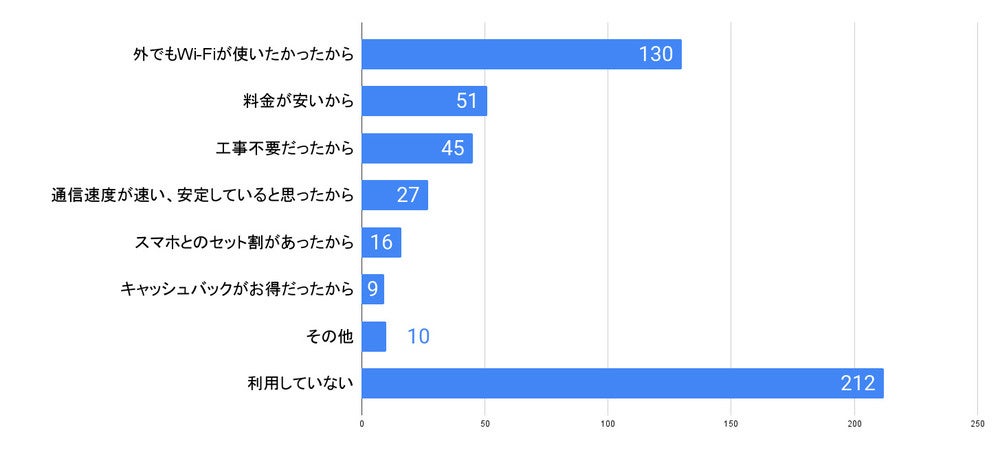 また、ポケット型Wi-Fiを利用する理由として、「外でもWi-Fiが使いたかったから」が最も多かった。