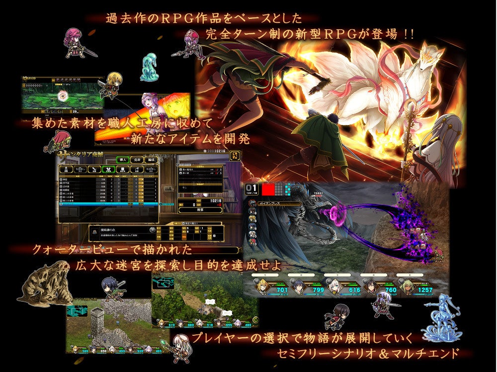 - 完全ターン制の新型RPGで、広大な迷宮やセミフリーシナリオ、マルチエンドが特徴
