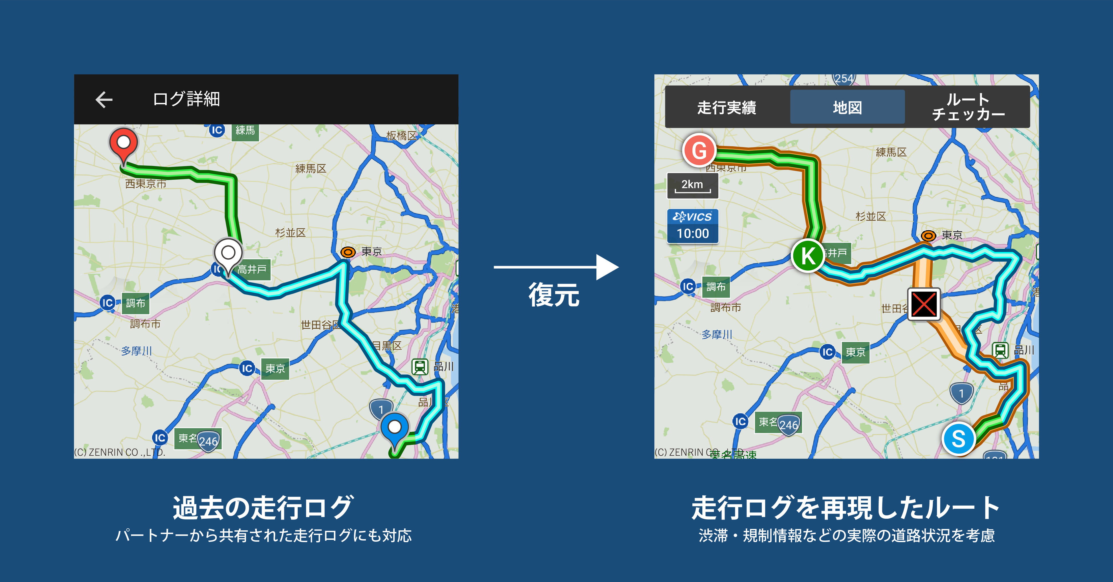 ユーザー自身の走行ログもしくは、パートナーに登録しているユーザー間で走行ログを共有できる「ログ共有」機能で共有された走行ログを元に、ルートを作成できる。
