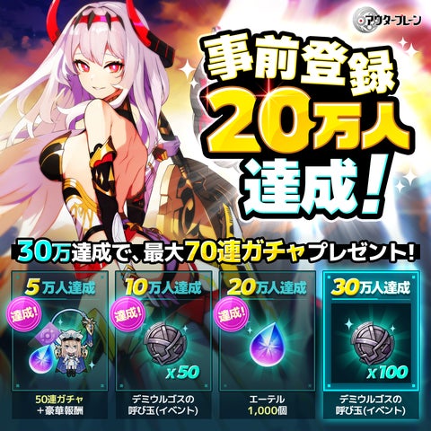 - 事前登録者数は20万人を突破し、最大70連ガチャが無料で楽しめる特典も