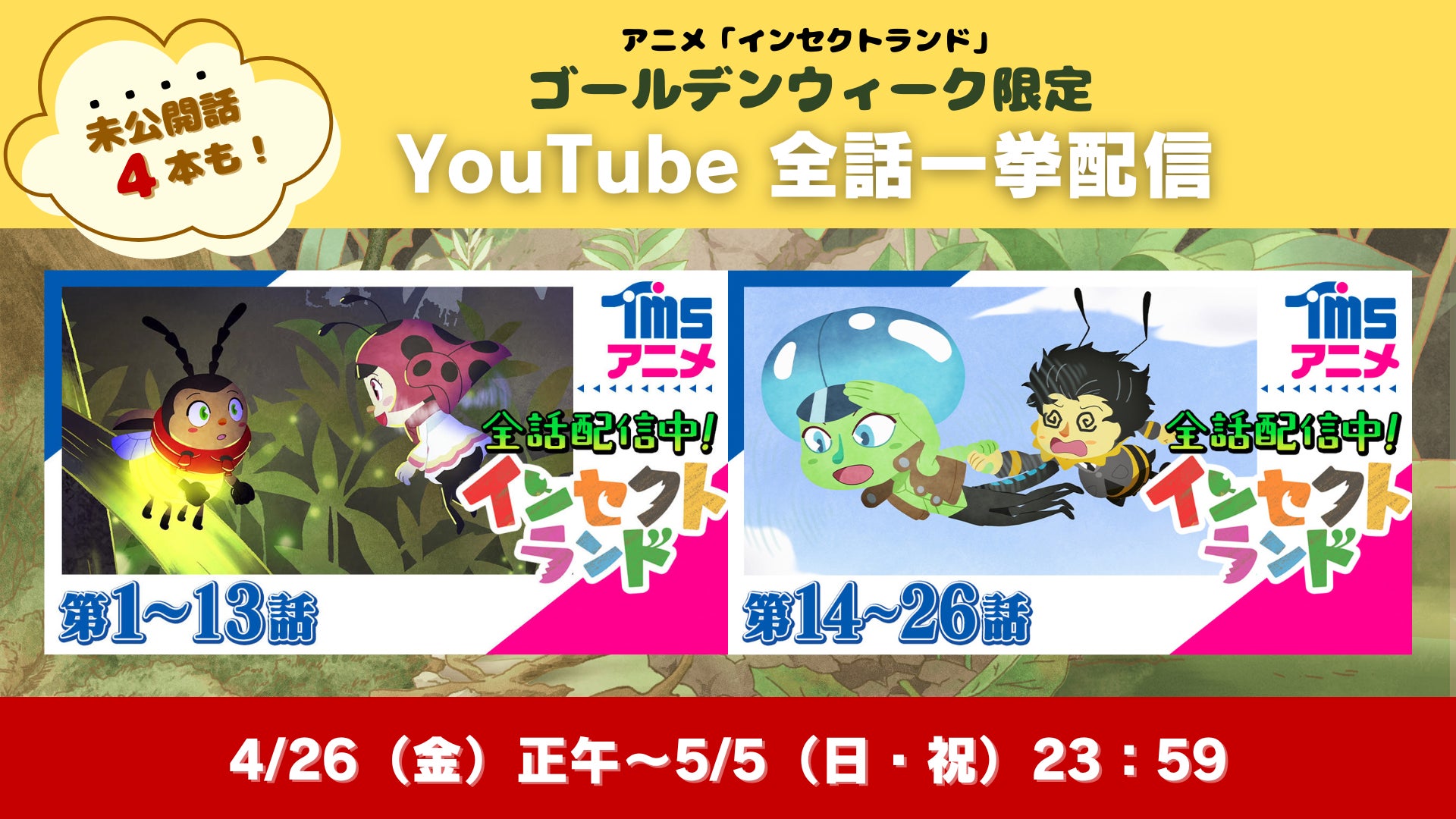 アランチヲネ株式会社がYouTubeで『インセクトランド』全26話を4月26日から5月5日まで一挙配信します。