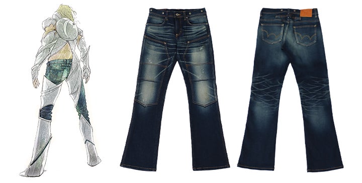 イーノックとルシフェルが着用していたジーンズが再現され、縦横に伸びる生地や新デザインの革ラベルが特徴です。