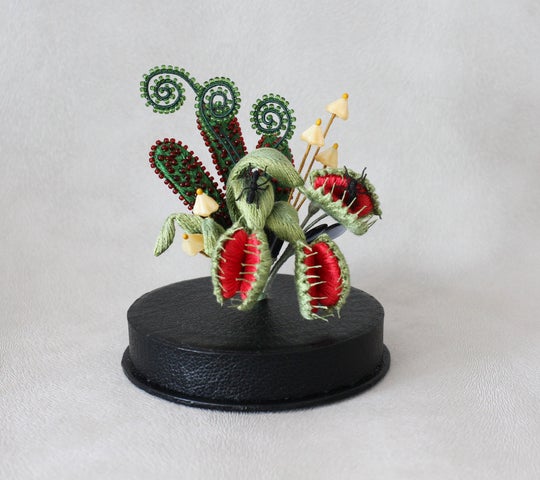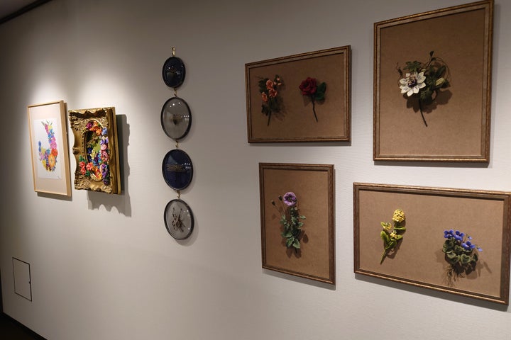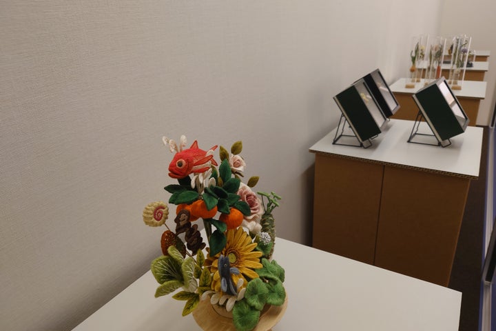 一方、PieniSieniさんは立体刺繍を用いて植物や昆虫をフェルトで表現し、作品に華やかさとぬくもりを与えています。