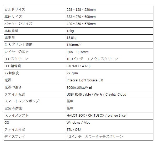 - 8K、29.7μmのXY解像度で繊細なプリントを実現し、ビルドボリュームを228*128*230mm(6712cm³)としており、価格は税込85,900円でPERGEARにて販売されている。