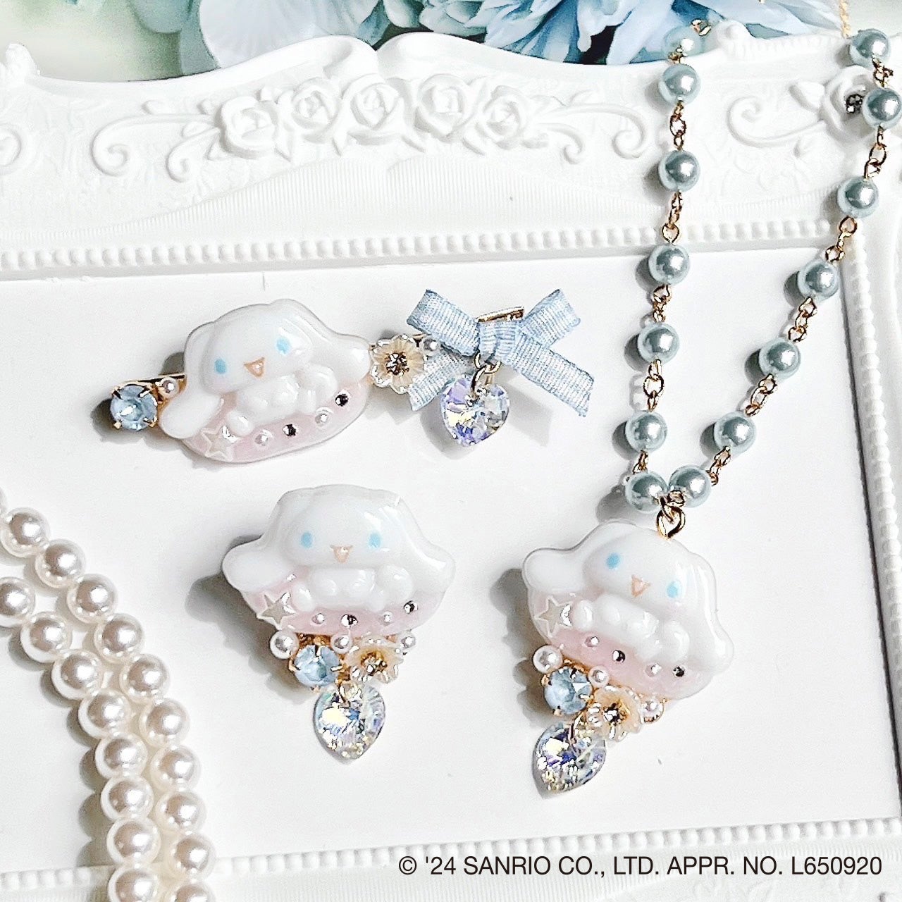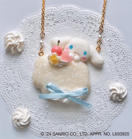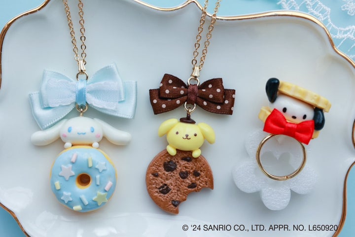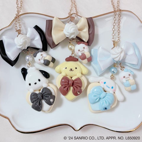 シナモロールやポムポムプリンのガラスブローチ、クッキーブローチ、ネックレス、ぬいぐるみペンダントなどがあります。