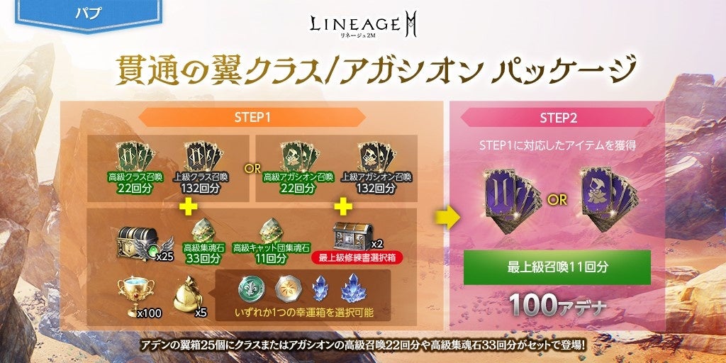 「アデンの翼箱(刻印)」25個に、クラスまたはアガシオンの高級召喚22回分と、上級召喚132回分、「アデンの高級集魂石II(11回)(刻印)」3個などがセットになった「貫通の翼クラス/アガシオン パッケージ」が登場しました。