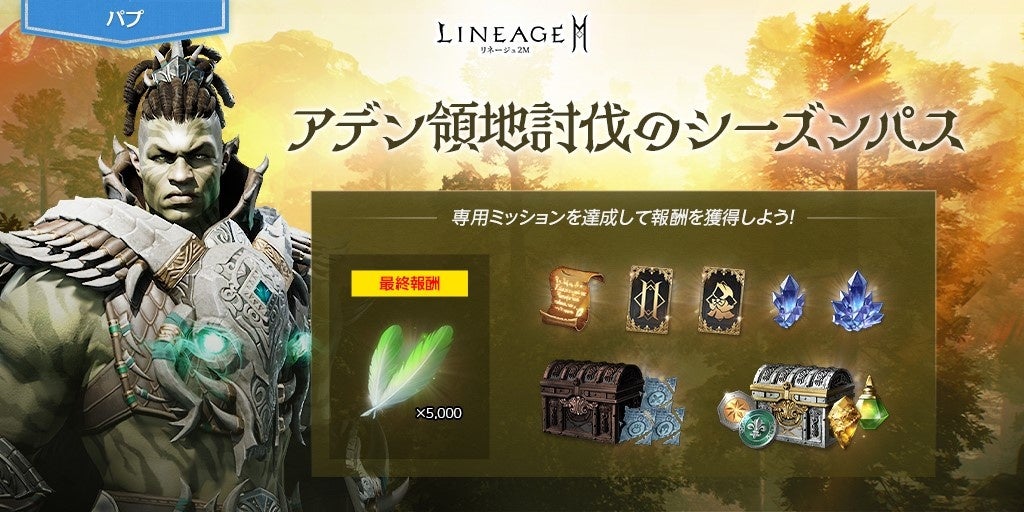 期間中、毎日達成していくデイリー ミッションと2週間でクリアを目指すシーズン ミッションで構成された、新規シーズンパス「アデン領地討伐のシーズンパス」が登場します。デイリー ミッション、シーズン ミッションをそれぞれ達成してシーズンパスEXPを獲得し、パス レベルを上昇させることで、「アデン領地の討伐箱(イベント)」や「光る希少級製作図の欠片箱(イベント)」など、様々なアイテムを報酬として獲得することができます。また、1,000,000アデナを使用することでプレミアム報酬を有効化することができます。最終報酬として、「アインハザードの祝福」5,000を獲得することが可能です。