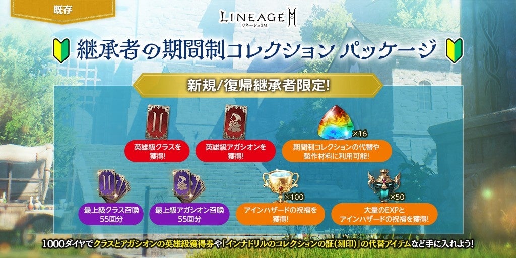 期間中、新規または復帰された継承者様限定で購入ができる「継承者の期間制コレクション パッケージ」が登場しました。クラスとアガシオンの最上級召喚55回分や、「女王の英雄級クラス獲得券II(1回)(刻印)」、「女王の英雄級アガシオン獲得券(1回)(刻印)」「祝福されたアインハザードの聖水(刻印)」50個、「継承者の期間制コレクション代替証(刻印)」16個などがセットになっています。