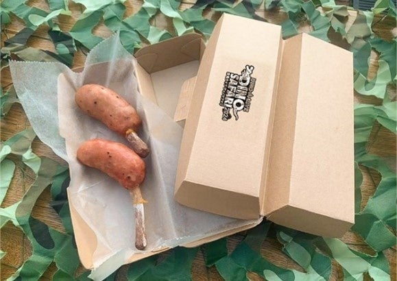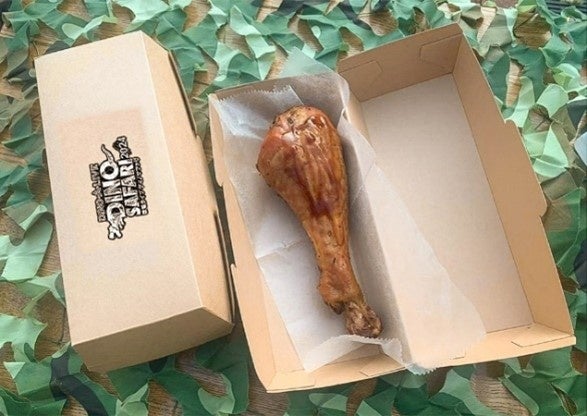 - たまごの容器に入ったジュース、フード、たまご、ガブリっとターキーレッグ、チュロス