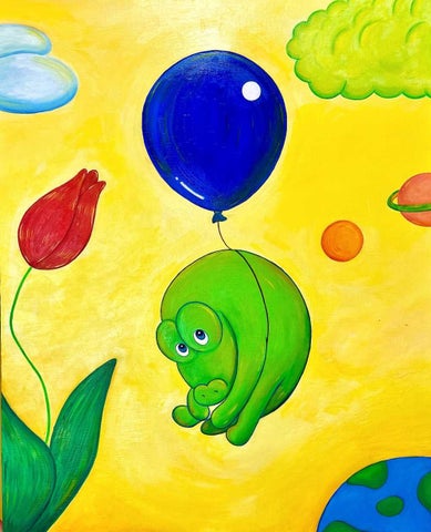 ワニが青い風船に吊るされて旅立つ「Bon Voyage!」の絵画は、地上の世界が遠ざかっていく様子や風船が破れるかもしれない不安と希望が表現されています。