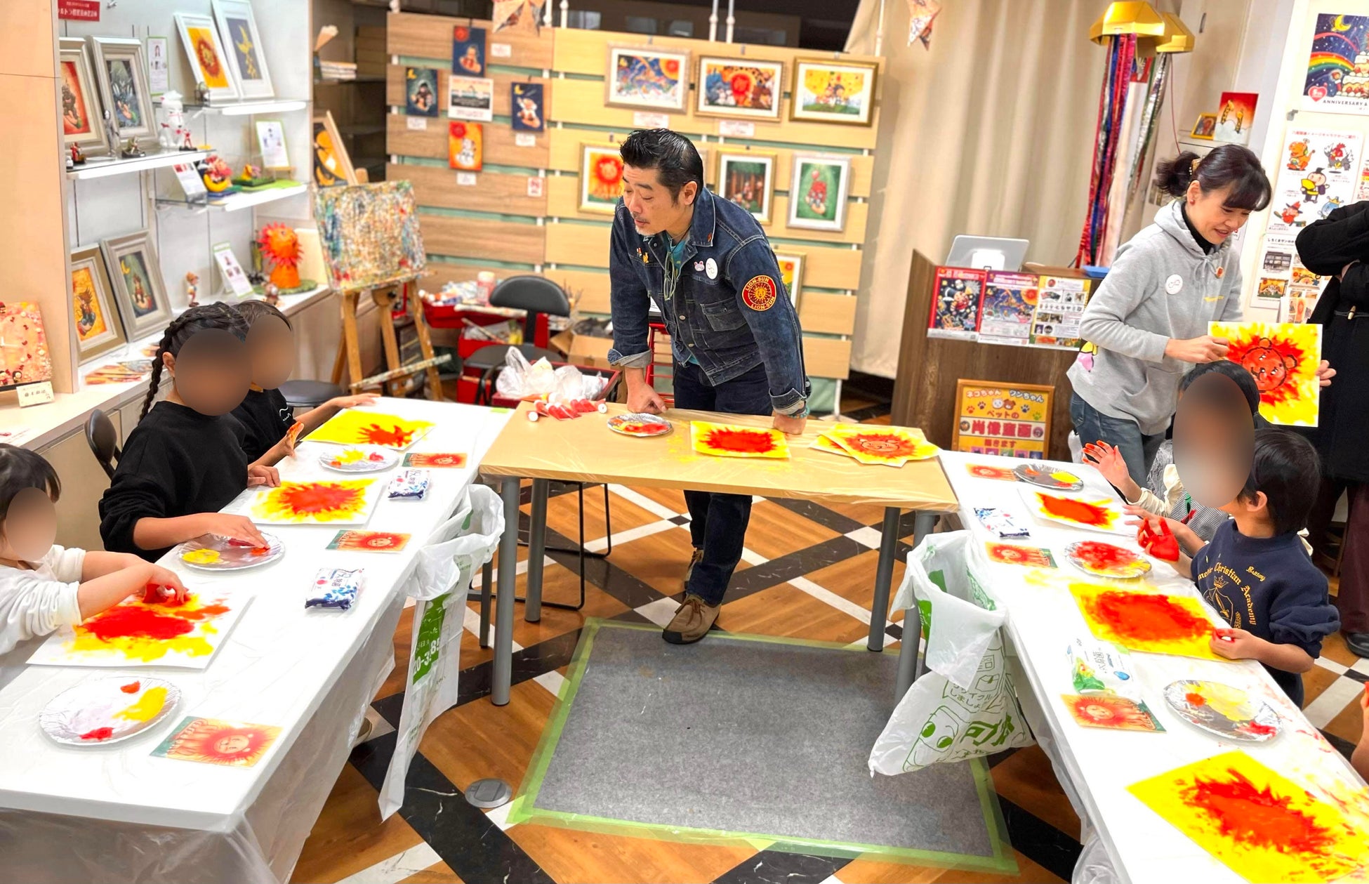 徳治昭本人も会場に滞在し、ワークショップでは指でらいおんサンを描くことができます。