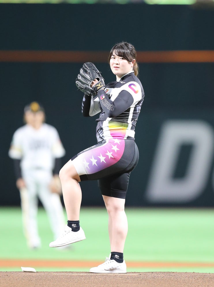 始球式ではガールズケイリンの尾方真生選手が投手役を務め、会場を盛り上げました。
