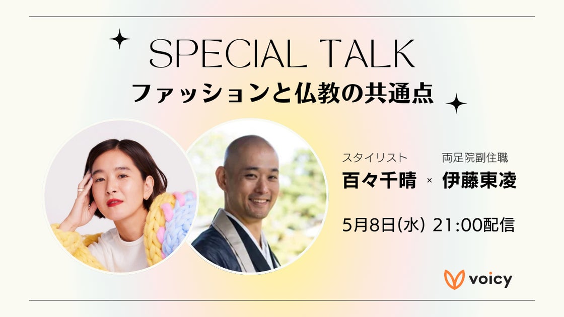 音声プラットフォームVoicyは、2024年5月8日にスタイリスト百々千晴さんと僧侶伊藤東凌さんの特別対談をプレミア公開します。