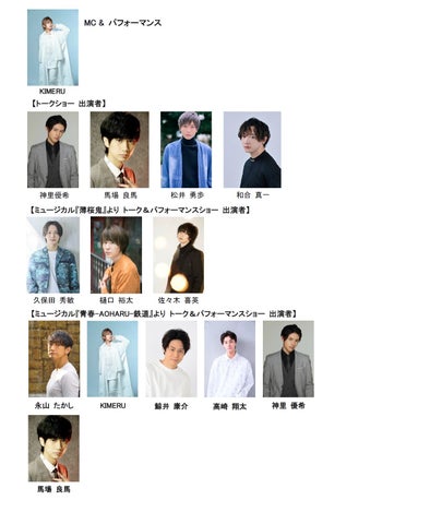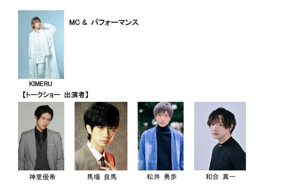 俳優たちによるトークショーとスペシャルパフォーマンスが予定されており、ミュージカル『薄桜鬼』や『青春-AOHARU-鉄道』の代表曲も披露されます。