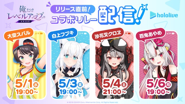 人気VTuberたちが『俺だけレベルアップな件:ARISE』を日替わりでライブ配信中!正式リリースは5月8日予定で、大空スバル、白上フブキ、沙花叉クロヱ、百鬼あやめが先行プレイを披露中。