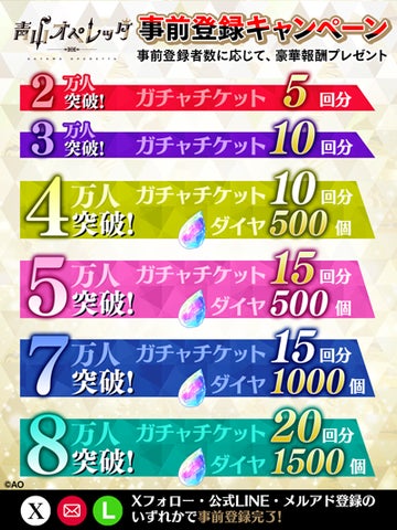 2024年6月30日までにチュートリアルをクリアすると、青山オペレッタのゲーム内特典としてガチャチケット15回分とダイヤ500個がプレゼントされます。