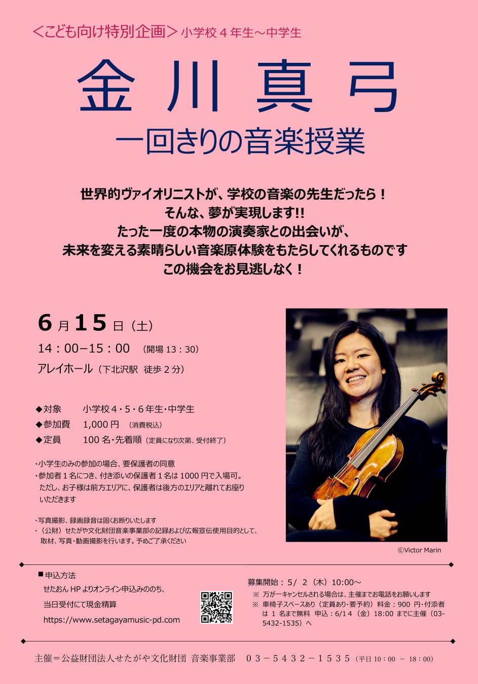 世界的なヴァイオリニスト金川真弓が学校の音楽の先生に!2024年6月15日(土)14:00~15:00、アレイホールで開催される音楽授業。