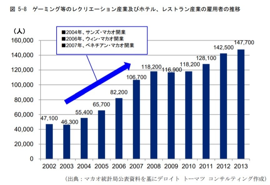IR施設の開発は、地域経済に大きな影響を与えることが期待されており、大阪府が発表した報告書によると、2030年までにIR施設の開発による生産増加額は約1兆3300億円、雇用創出は約9.7万人に達すると予測されています。同様に、東京都が行った調査報告書によると、海外のIR施設では、開業後にゲーミングやレクリエーション、ホテル、レストラン産業での雇用が増加し、5年で2倍以上にも増加したことが報告されています(図1)。これらの結果から、日本国内においても、カジノIR業界への新規参入を検討をする企業の増加やポーカーイベントへの集客など、マーケティングニーズの拡大が期待されます。