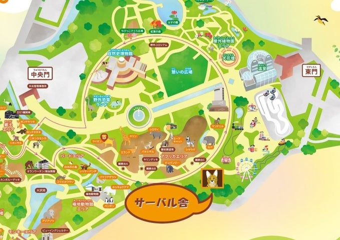 - 天井の高い放飼場を備え、夜行性動物館で飼育されていたオスのサーバルも引っ越し