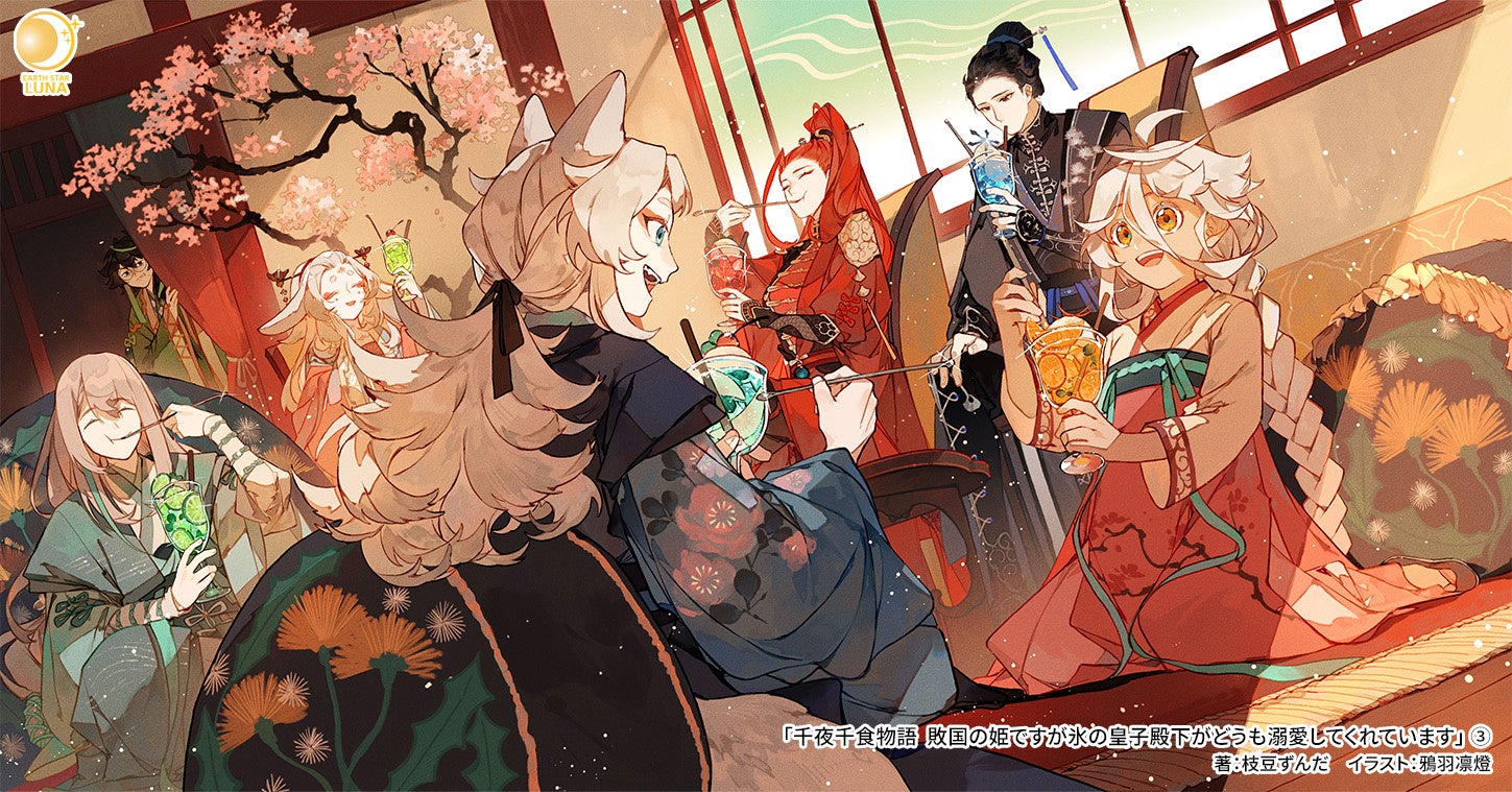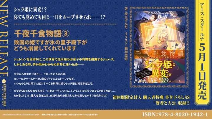 2024年6月3日に発売される『千夜千食物語 敗国の姫ですが氷の皇子殿下がどうも溺愛してくれています』では、シェラ姫がループする異変に巻き込まれます。