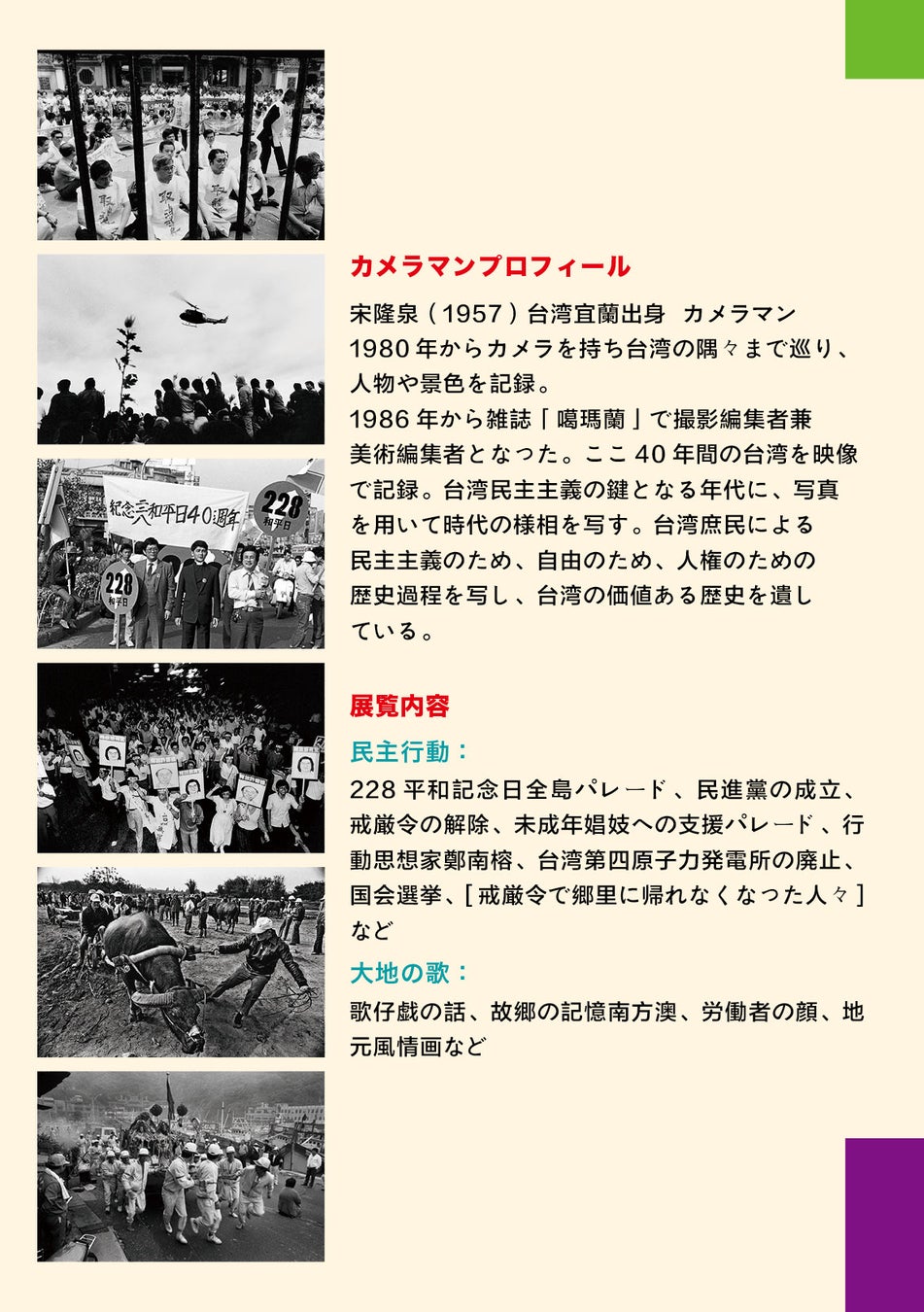 展示では民主化運動や台湾の歴史的瞬間がテーマとなり、開幕式には宋隆泉本人も出席します。
