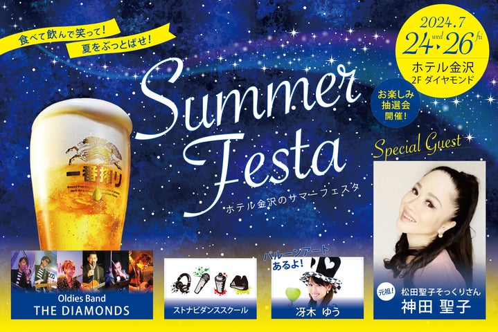 ホテル金沢主催のSUMMER FESTA2024では、神田聖子さんのものまねショーに加え、Oldies BandのTHE DIAMONDSさんやストナビダンススクールさんがスペシャルゲストとして登場します。