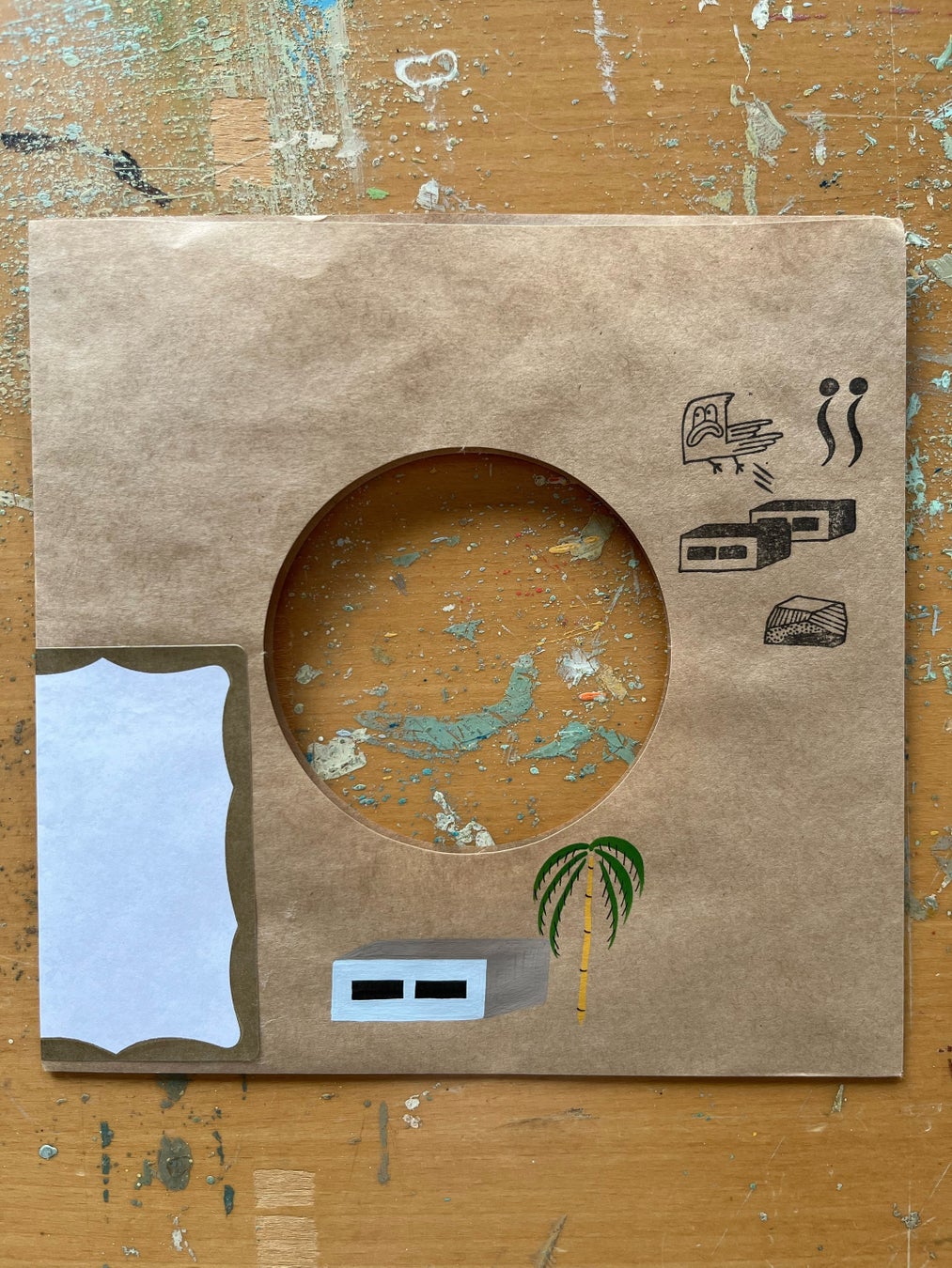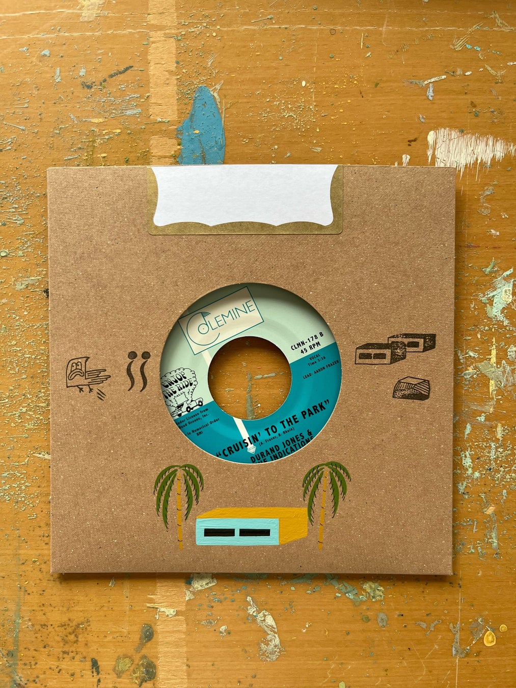 7インチレコードのジャケットやスリーブに絵を描き、ネームラベルも貼って紛失を防ぐ工夫がされています。