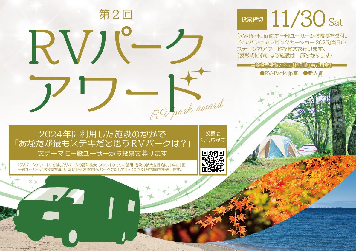 日本RV協会は、車中泊施設「RVパーク」の認知拡大を目指し、株式会社ブシロードムーブと共同で第2回「RVパークアワード」を開催します。
