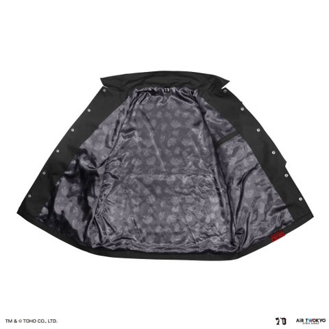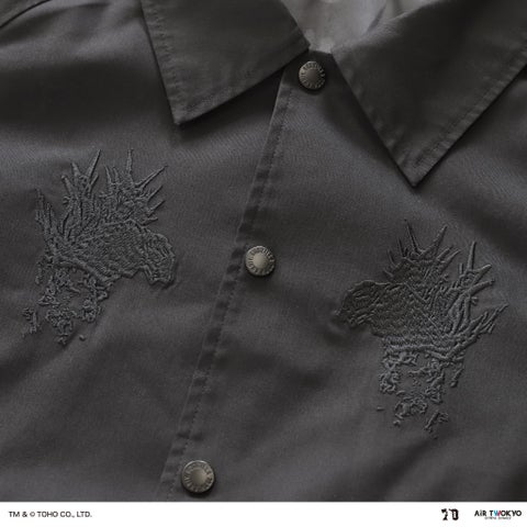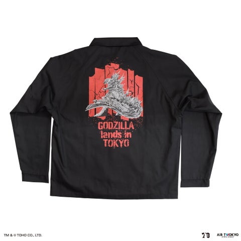 コーチジャケットにはゴジラの刺繍や背中のデザインが施され、裏地には横顔や足跡の総柄が。