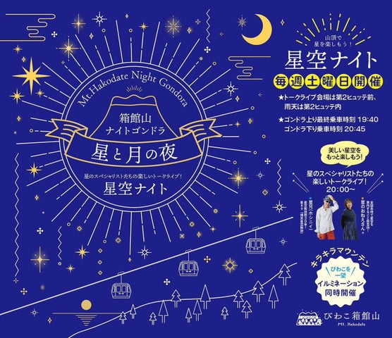 ナイトゴンドラの運行やブルーイルミネーションなどのイベントが毎週土曜日に開催され、星空トークライブも楽しめます。
