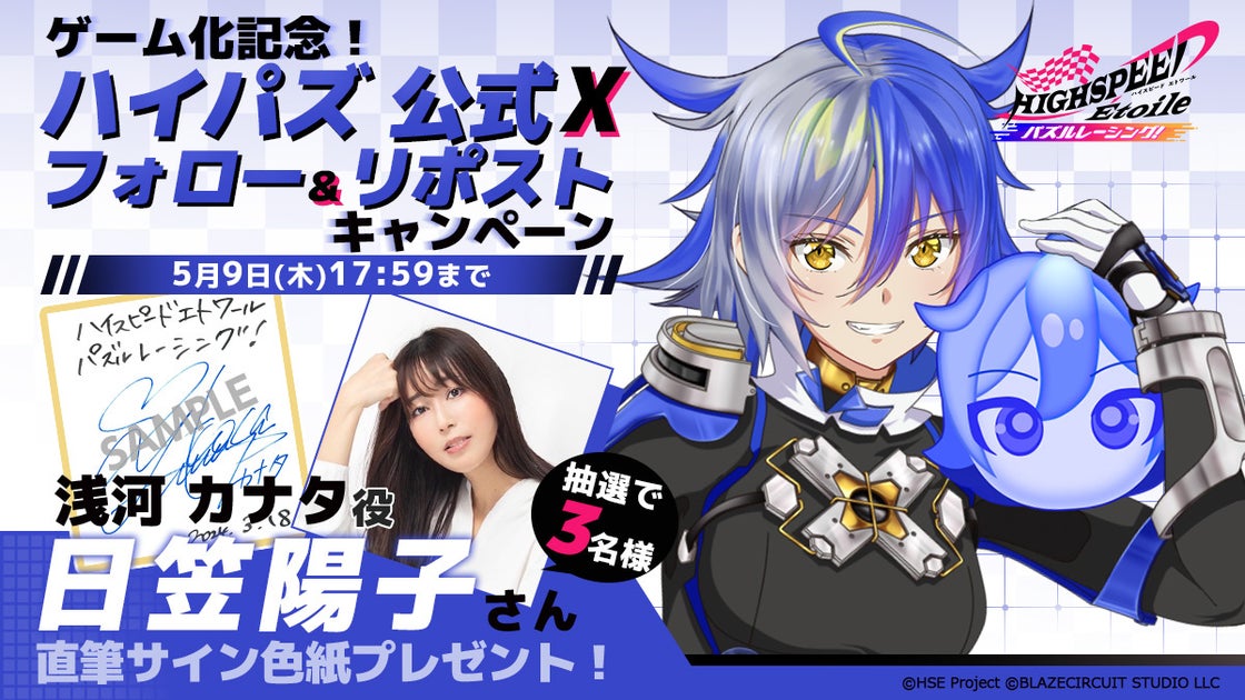 BlazeCircuit Studioは、「HIGHSPEED Étoile パズルレーシング!」のゲーム化を記念して、声優のサイン色紙をプレゼントするキャンペーンを実施中。