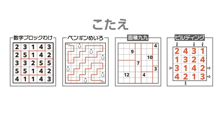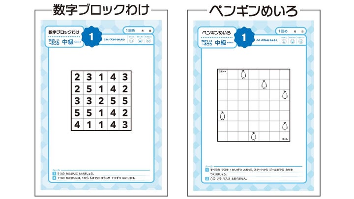 人気のパズルには「数字ブロックわけ」「ペンギンめいろ」「面積九九」「ビルディング」が含まれ、未就学児から大人まで楽しめる内容です。