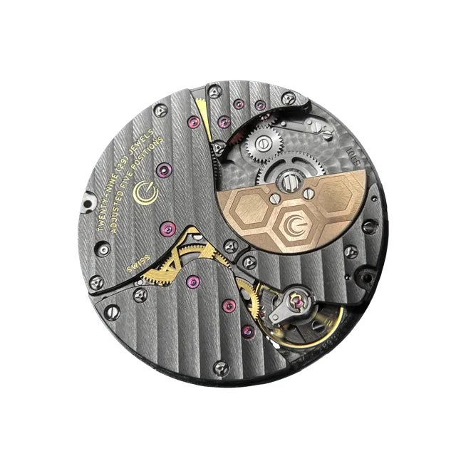 ムーブメントはマイクロローター構造で驚異的な薄さを実現し、ジェラルド・チャールズ独自の星型ネジが使用されています。