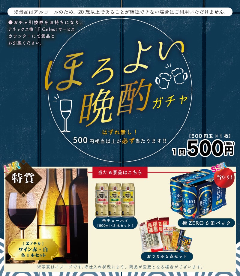 特賞は1万円分の利用券で、グルメや晩酌アイテム、お菓子などが当たります。