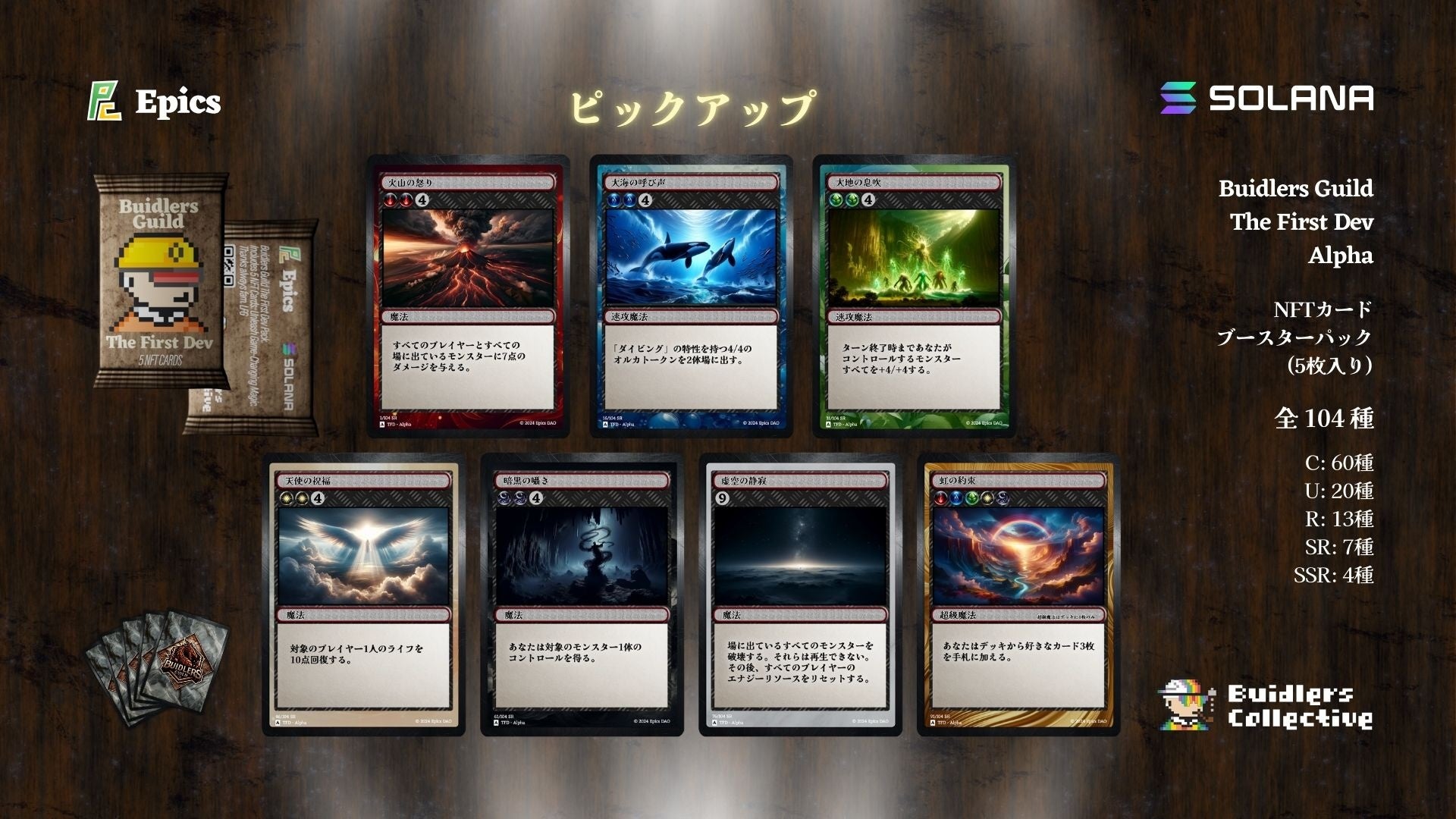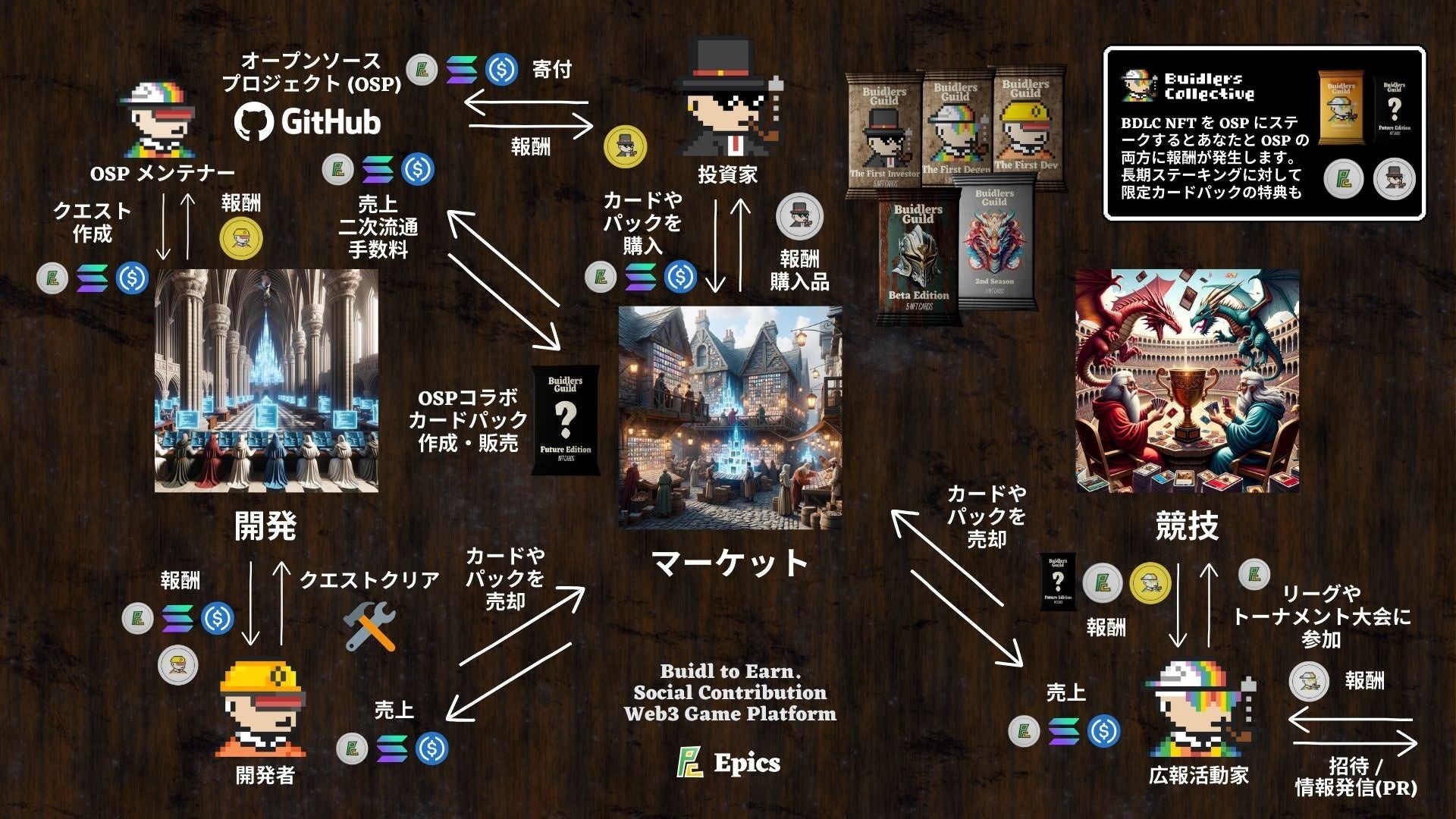 Epicsプラットフォームでは、社会貢献型Web3 NFTカードゲーム「Buidlers Guild」を展開し、オープンソースソフトウェア開発を支援しています。
