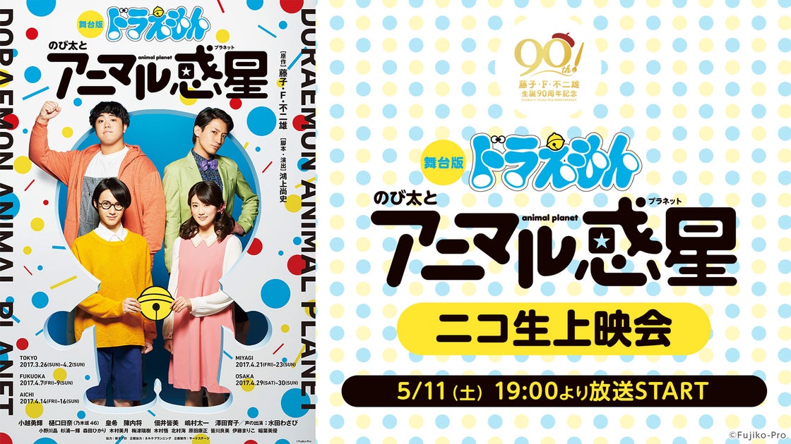 5月11日(土)19:00から、藤子・F・不二雄先生の生誕90年記念として2017年に上演された舞台版ドラえもん「のび太とアニマル惑星」がニコメンチャンネルで配信されます。
