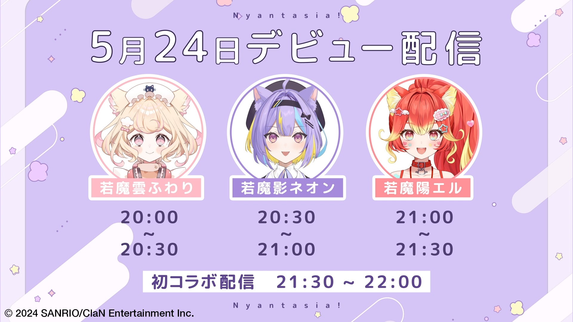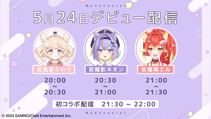 若魔影ネオン、若魔雲ふわり、若魔陽エルの3名がデビューし、5月24日に各YouTubeチャンネルで配信予定です。