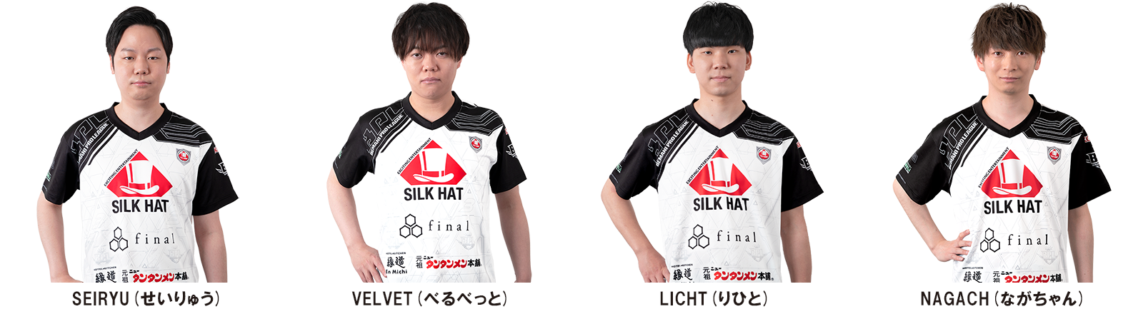 『BEMANI PRO LEAGUE -SEASON 3- beatmania IIDX』でのTEAM SILK HATは、前シーズンから引き続きのSEIRYU選手、KIDO.選手に加えて、新たにVELVET選手、LICHT選手を迎え、それぞれの実力はもちろん、『SILK HAT』らしいチームワークが発揮できる強力なチームとなりました。