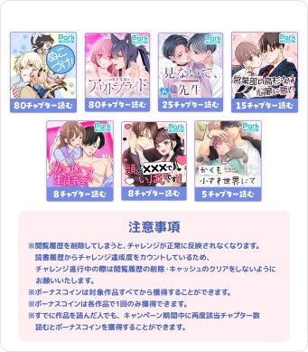 さらに、マンガParkで人気の7作品を読むと、合計165ボーナスコインがGETできる読書チャレンジマラソンも開催中。